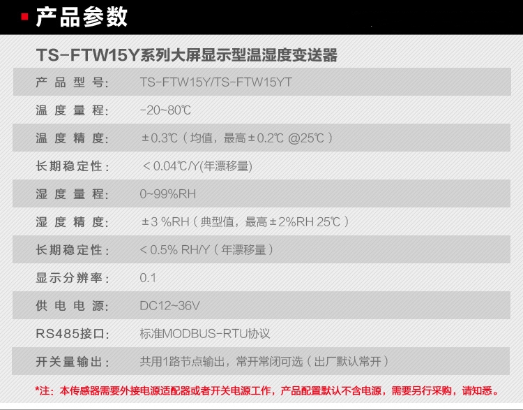 *注:本传感器需要外接电源适配器或者开关电源工作,产品配置默认不含电源,需要另行采购,请知悉。